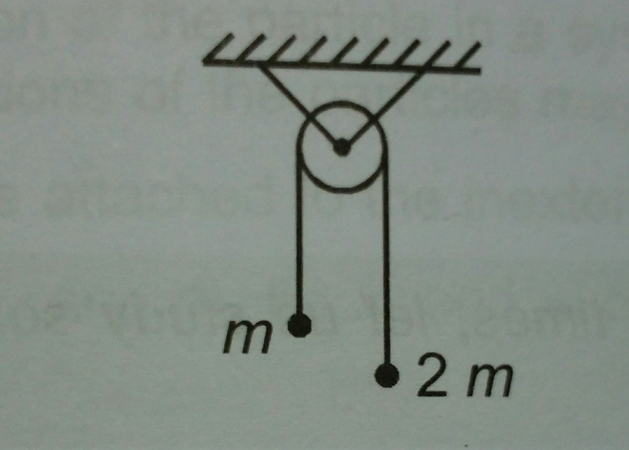 Two objects of masses m and 2m are connected by a mass less string passing over a fixed smooth pulley. The acceleration of heavier mass wrt the lighter mass is(1) 8g/3(2) 4g/3(3) 2g/3(4) zero
