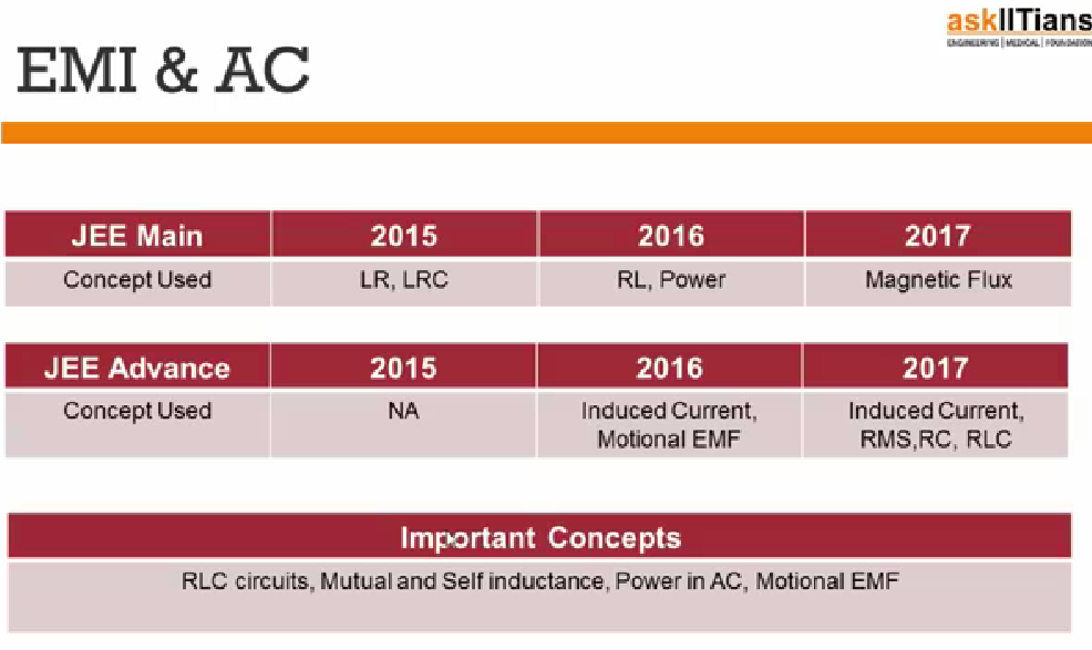 From Electromagnetic Induction and Alternating Currents, the common question that comes in JEE Mains and Advanced is from RLC (Resistor-Inductor-Capacitor). Question from this topics comes either in JEE Mains or JEE Advanced.