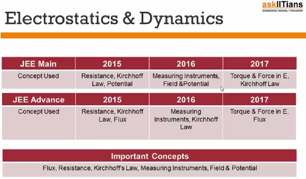 Under these topics, Electrostatics mainly covers Field & Potential and Dynamics mainly covers Current Electricity. If JEE Mains is considered then ‘Kirchhoff’s Law’ is most frequently appearing topic. In case of JEE Advanced, Flux is highly favoured topic and has a high possibility of coming.