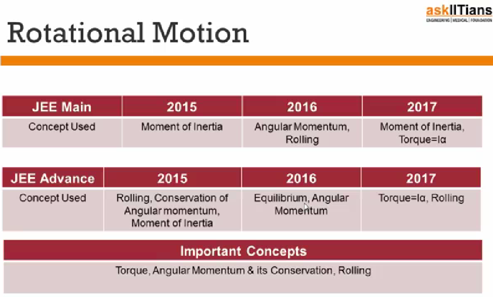 In Rotational Motion the most commonly appearing topic is ‘Angular Momentum’. From this, question from Angular Momentum & Rolling concept has high chances to come in JEE Mains while question from Conversation of Angular Momentum has high chances to come in JEE Advanced 2018.