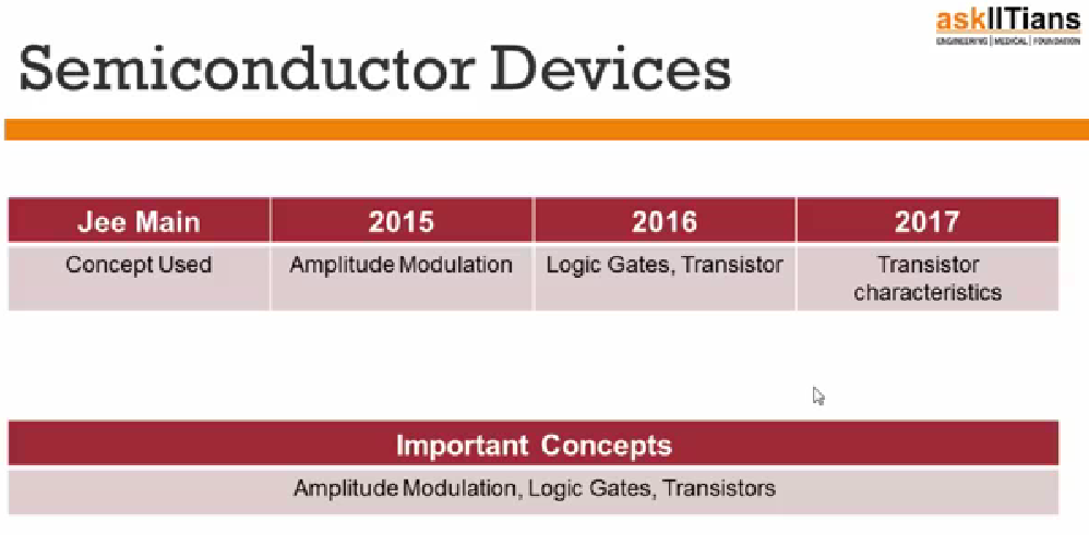 The first topics covered here is Semiconductor Devices, now here what you need to consider is that questions from transistor characteristics (graphs) are common in JEE. As per the analysis done by our experts, there are very high chances of a question from “Logic Gates” to come in JEE 2018. Below is how the important topics have featured in past few years JEE exams.