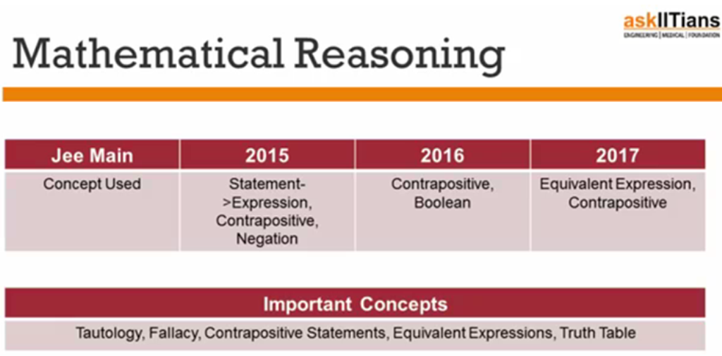 This is one of the most important topic and highly based on your conceptual understanding. It generally consists of statements from Tautology, Fallacy, Contrapositive Statements, Equivalent Expressions, Truth Table. Below is the analysis how this topic has been used in JEE exam in past 3 years.