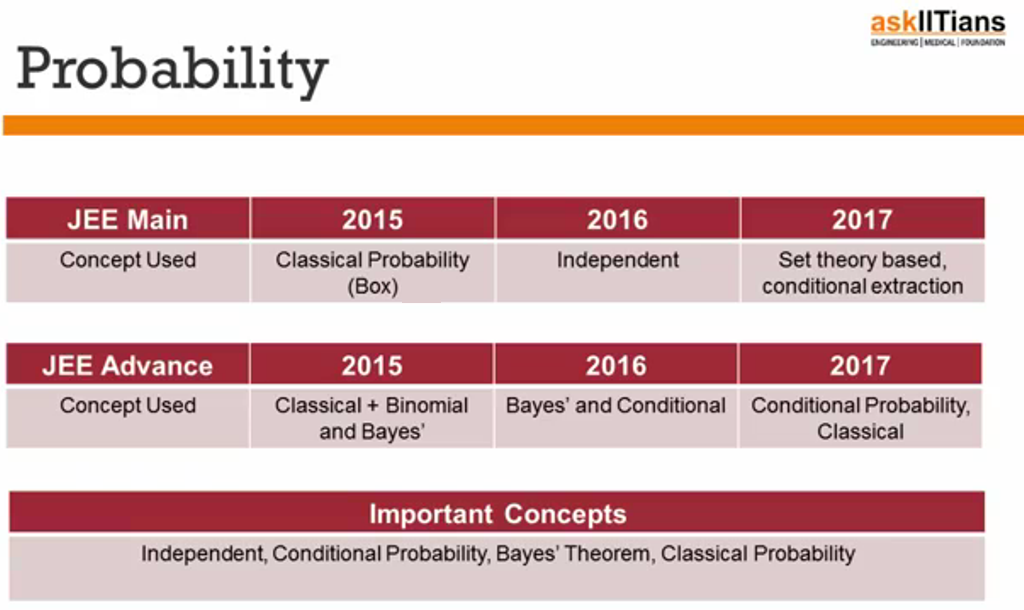 The second topic that will come in the exam is Probability. Talking about the favourites, Classical probability is the one in JEE Mains and Bayer’s Theorem in JEE Advanced. Both of them will surely come in JEE Mains and JEE Advanced respectively. Below is the analysis how this topic has been used in JEE exam in past 3 years.