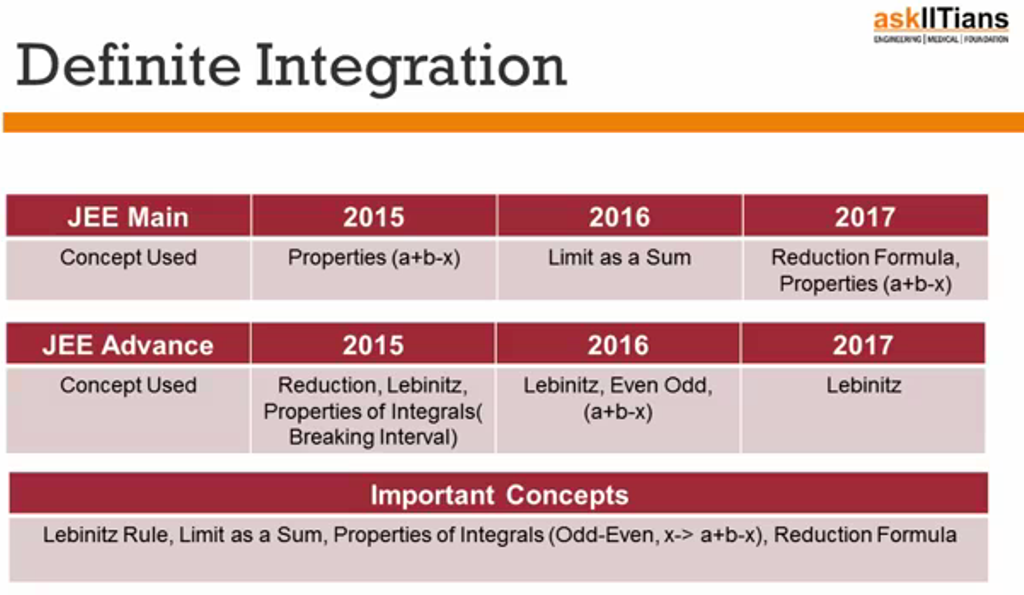 Well, Integration is one topic that is hated most by JEE aspirants but it is favourite of examiners, Definite Integration in JEE Mains and Indefinite Integration in JEE Advanced. The important concepts from this topic and how they have appeared in previous papers is shown in the analysis below.