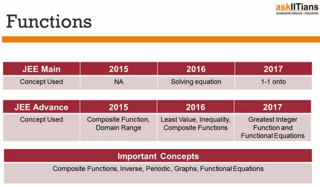 Well, out of all the topics being discussed here, Functions is the most conceptual based chapter and there is a guarantee that you will not get any direct question from it, be it JEE Mains or Advanced. And a sound understanding of this topic will help you in cracking other topics such as Application of Derivatives and Integration. Here, you should remember that greatest integer and MOD function are the most frequently appearing concepts.