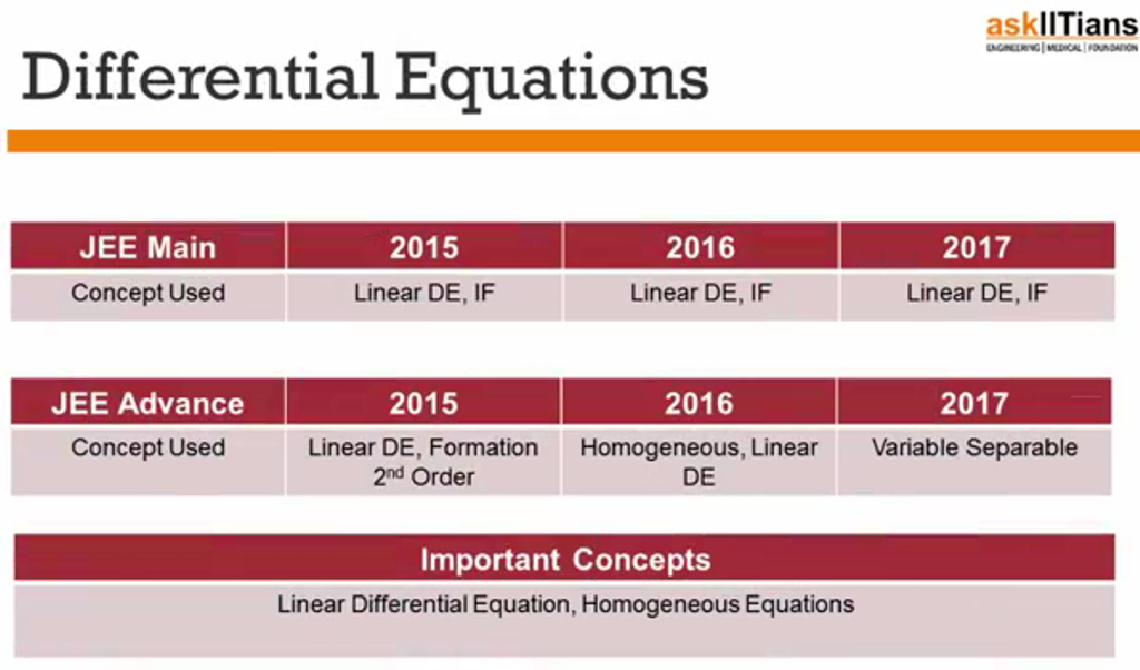Well, this is one of those topics which can fetch you marks not even in JEE Mains but also in JEE Advanced as it is the most frequently appearing topic in both the exams. The two important concepts covered in this topic are Linear Differential Equation and Homogeneous Equation. The analysis is shown below.
