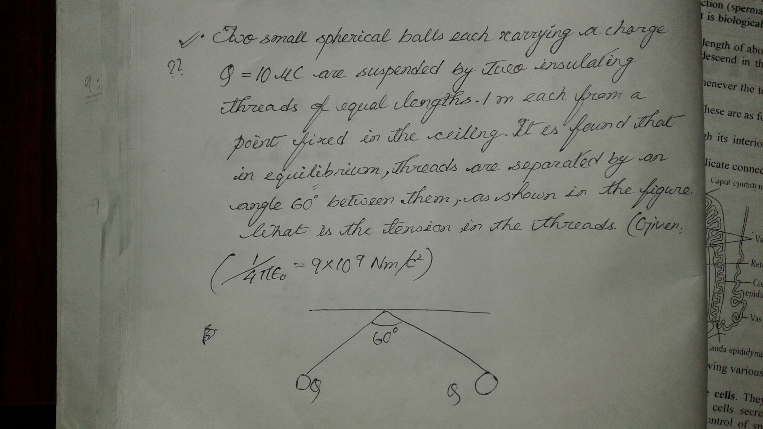 Two small spherical balls each carrying a charge Q=10 micro coulomb are suspended by two insulating thread of equal lengths 1 m from a point fixed in the ceiling.It is found that in equilibrium,thread are separated by an angle 60 degree between them,as shown in the figure.WHAT IS THE TENSION IN THE THREADS??