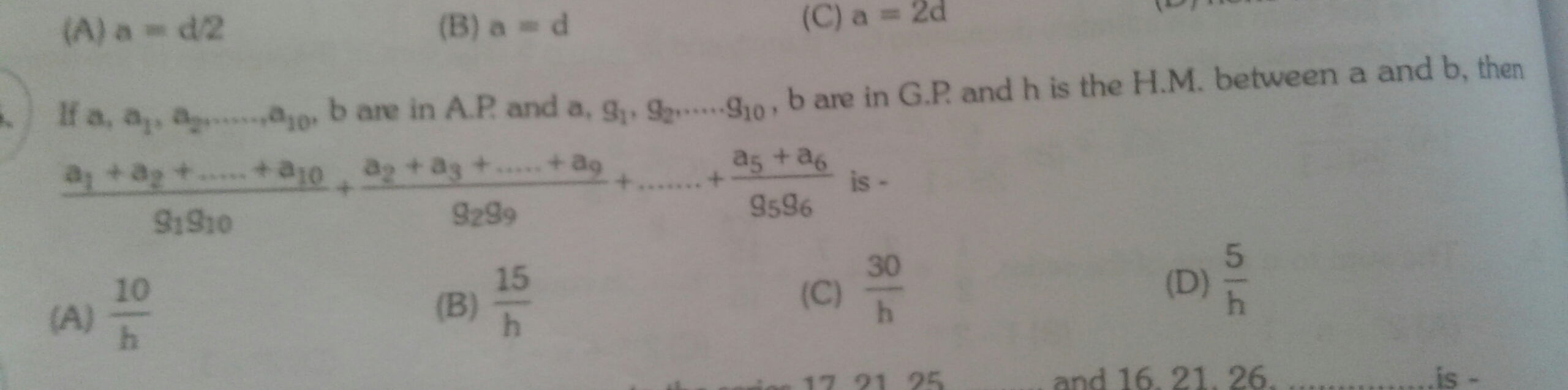 If a ,A1 , A2, A3 ....A10, b are in AP and and a, G1, G2, G3.... G10 b are in GP and H is the hm between a and b then A1 + A2 ....+A10/G1g10 + A2+A3....A9/G2G9 +.......A5A6/G5G6 is ....