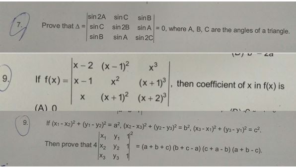 Post one question in one thread, anyways for the second one assume that if u expand determinant you will get some polynomial and there will be a term of x in the expansion hence diff both sides i.e det and polynomial and then put x=0 on both sides then on the RHS you will left with only x coefficient and on the LHS use differentiation of det