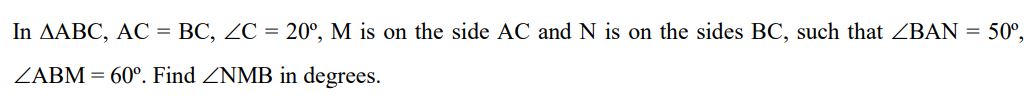 In triangle ABC, AC = BC, angle C = 20º, M is on the side AC and N is on the sides BC, such that angle BAN = 50º, angle ABM = 60º. Find angle NMB in degrees.