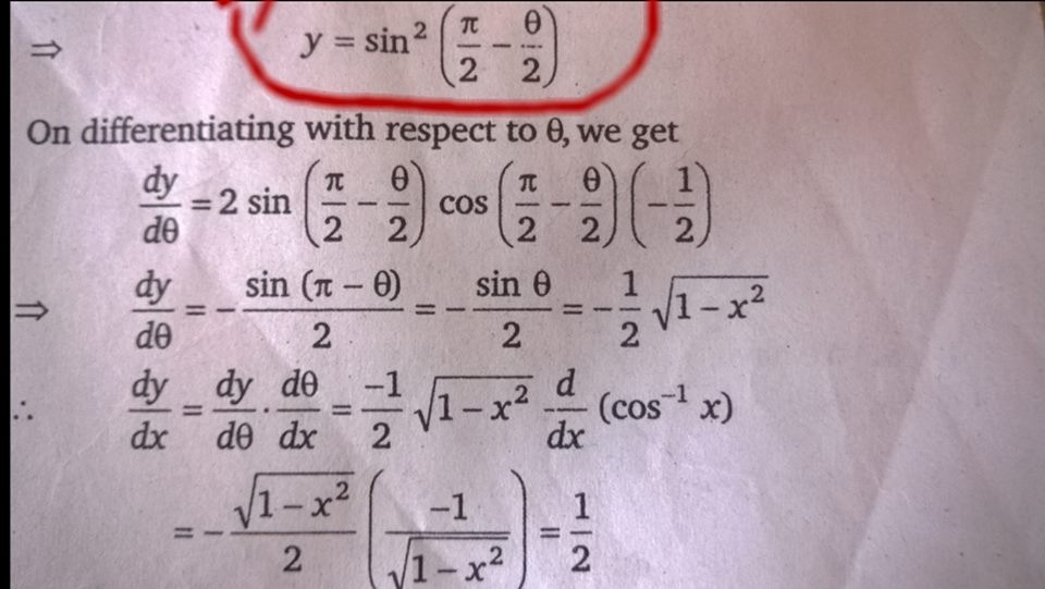 I made a circle in attachment …. .here theta = cos-1 x ...Lekin usne fir bhi theta ki value nhi rakhi ….wo theta ki value rakh ke bhi to x ke respect differential kar sakta tha …..please help me ….....