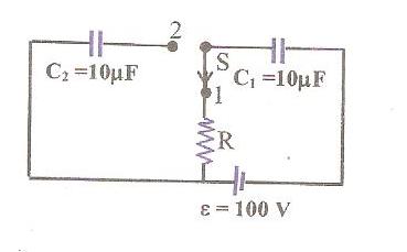 Two identical capacitors are connected in the circuit shown. C2 is charged to 100V and switch S is shifted from position 1 to position 2. The negative terminal of C2 is connected with the positive terminal of C1. Find the work done by the battery. If the polarity of C2 were reversed, what work would have been done by the battery?
