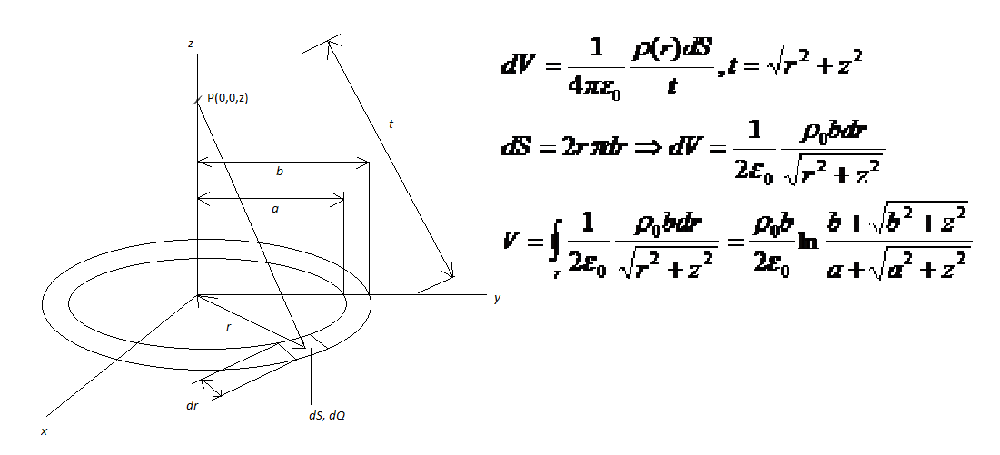 Can someone check this problem (solution is in the attachment)?Circular ring, with inner radius “a” and outer radius “b” is charged with surface charge density ρ(r)=ρ0b/r, where ρ0 is const. and r is between “a” and “b”. Find potential of point P(0,0,z).Thanks for replies.