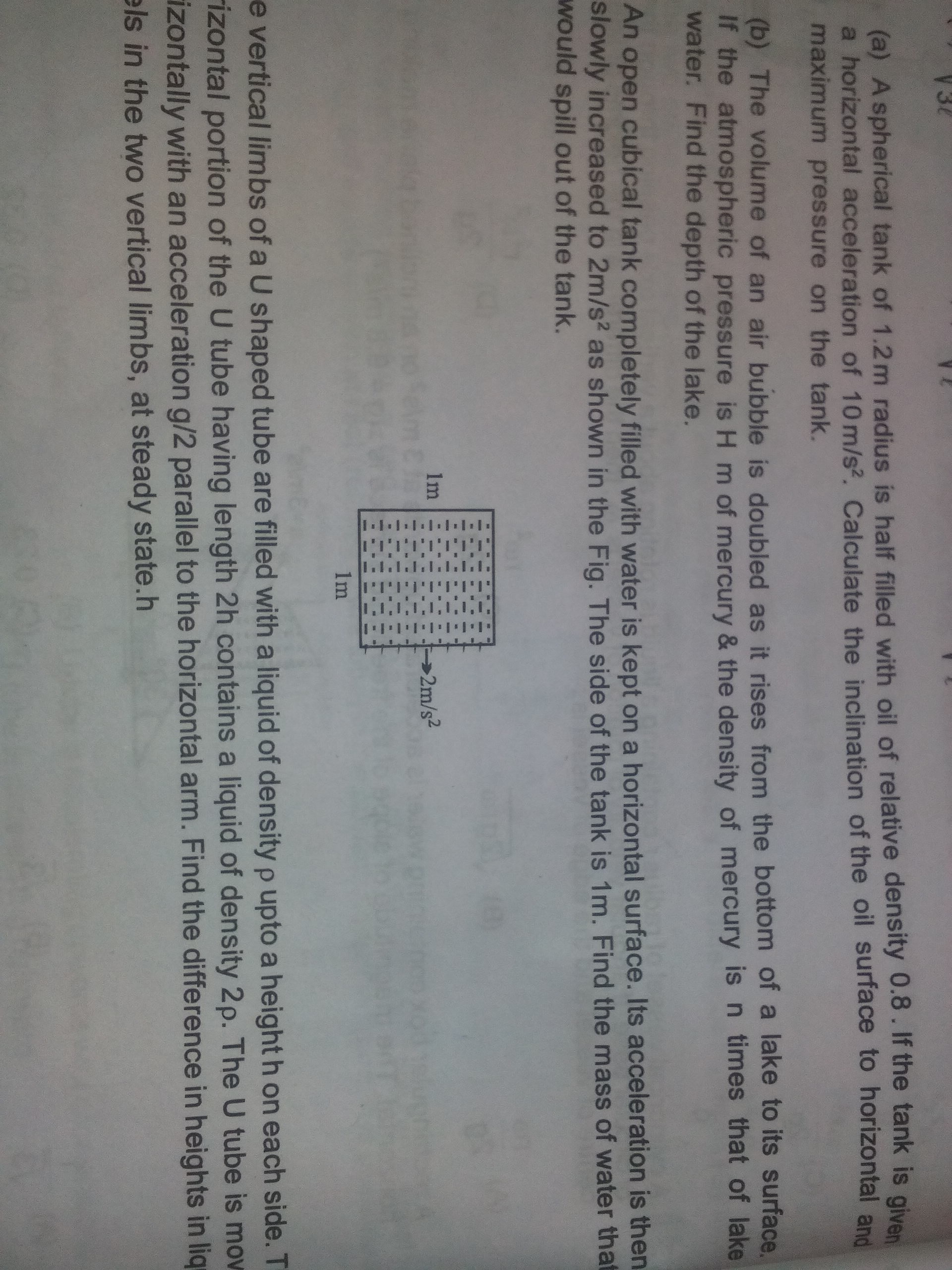 An open cubical tank open at top completely filled with water is kept on a horizontal surface its acceleration is then incresed to 2 m/s2 in horizontal direction the side of the tank is 1m find the mass of the water that would spill out of the tank.?