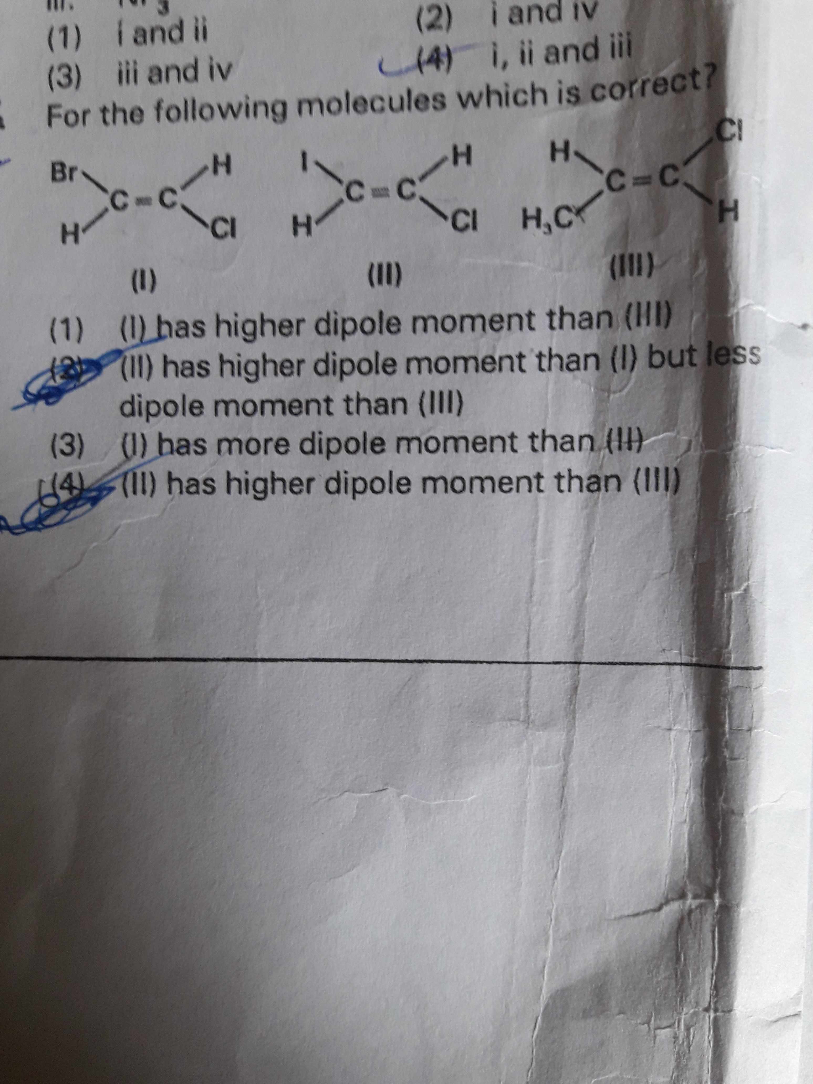 The solution is quite simple just got to look of the electronegativity which is highest for chlorine a bit less for bromine and least for chlorine the case of the CC bond is no difference of electronegativity so there`s no dipole moment is at the factory got to consider