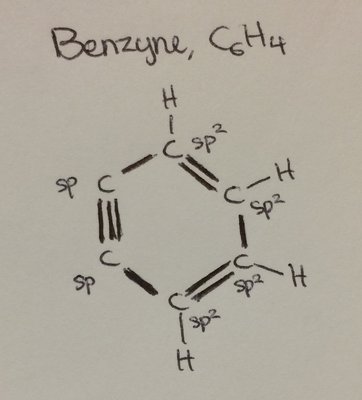Why the Carbon atom at triple bond position in Benzyne not sp hybridized?Why are they sp2 hybridized in place of sp?