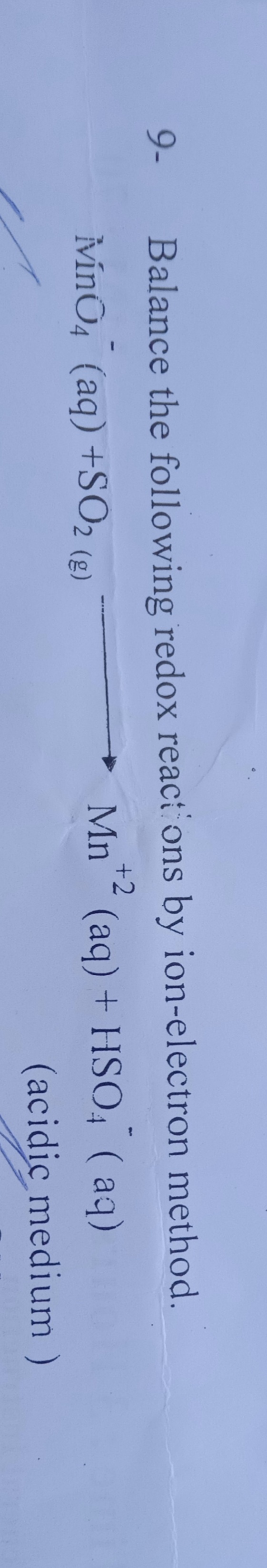 2MnO4- + H+ + 5SO2 + 2H2O -----> 2Mn2+ + 5HSO4-