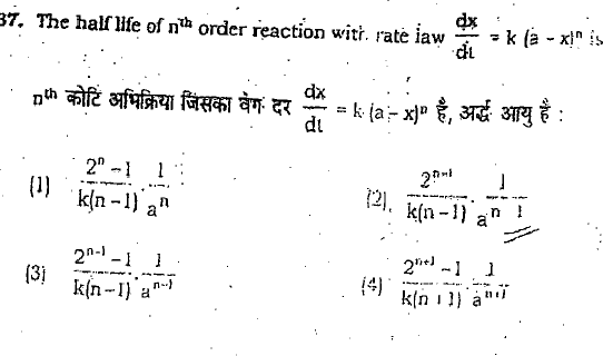 It`s all a simple integration related question as. dx/dt=K(a-x)^n ----> inegrating both sides of (1÷(a-x)^b)•dx = K•dt ,with limits "a—>a/2". Answer is second option pkease do approve my answer
