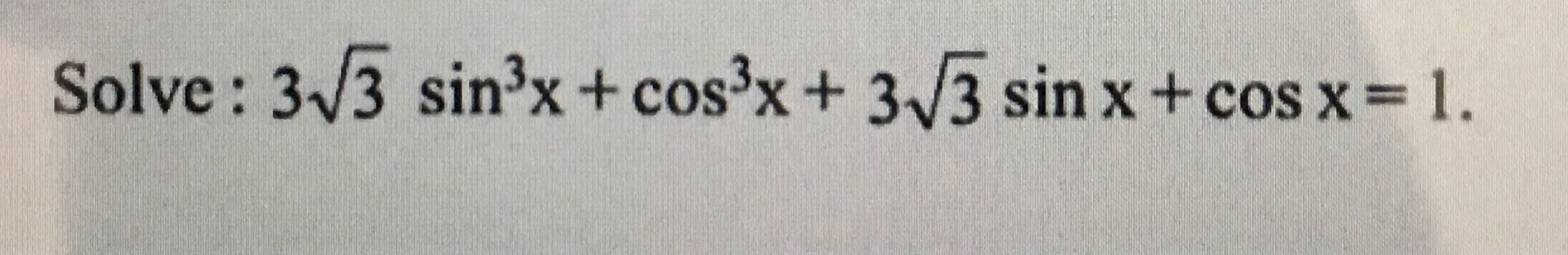 Solve for x3sqrt3sin^3x + cos^3 x + 3sqrt3sinx + cosx=1