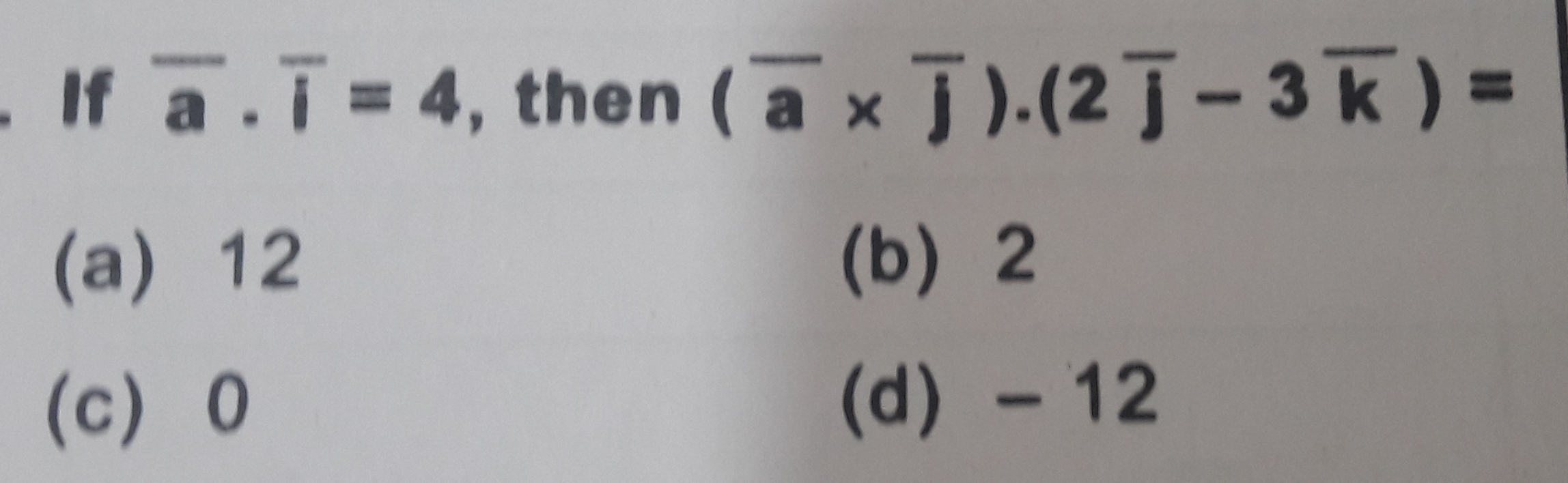 The product reduces to(\vec{a}\times \vec{j}).(-3\hat{k})=-3\vec{k}.(\vec{a}\times \vec{j})=-3(\vec{a}.\vec{i})=-12